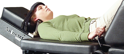 The upper torso is captured by a comfortable securing system incorporated into the fixed section of the table. The Patented Pelvic Tilt section will be electronically tilted, so that specific spinal segments can be targeted. With precise and pain-free computer controlled tension, the specific disc segment is gently distracted.